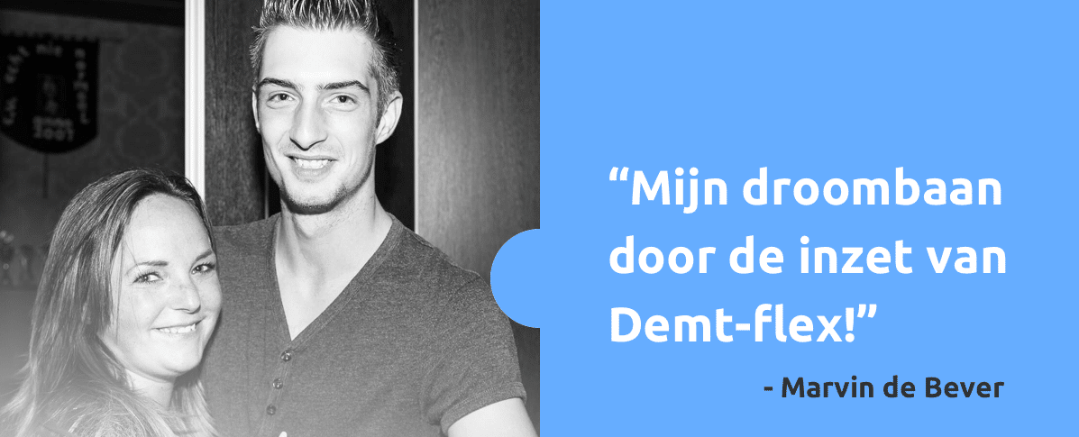 “Dankzij de professionele inzet van Demt-flex kunnen Mandy en ik nu samen bouwen aan een mooie toekomst. Hoe leuk is het dat mede door mijn vriendin, ik nu werk bij een heel fijn bedrijf waar ik me helemaal thuis voel!”.